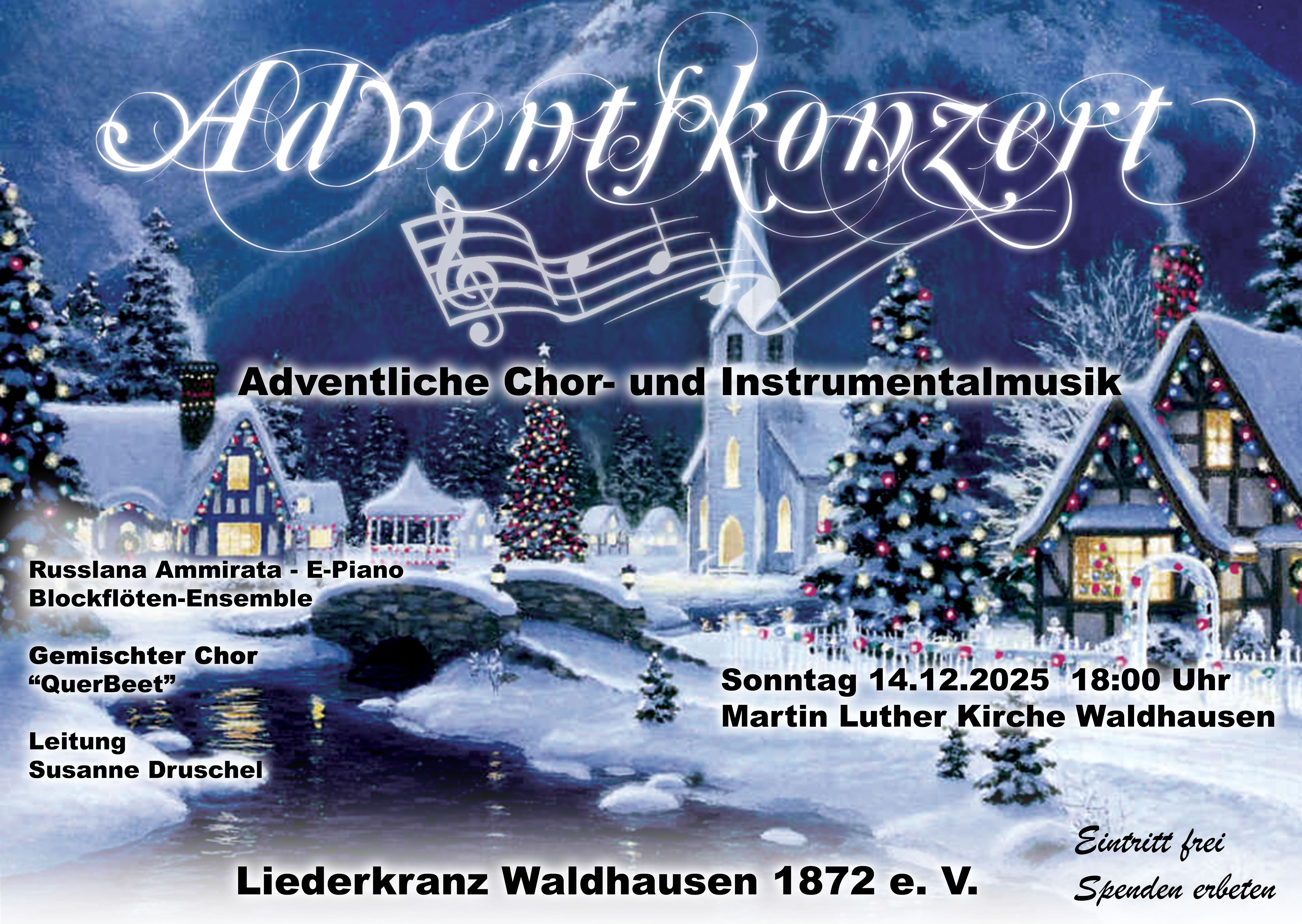 Wir freuen uns auf Ihren Besuch! Das Konzert beginnt um 18.00 Uhr. Der Eintritt ist frei – wir bitten um Spenden für unsere Vereins- und Chorarbeit. Im Anschluß laden wir zu einem kleinen Umtrunk mit Fingerfood und Gebäck ein.