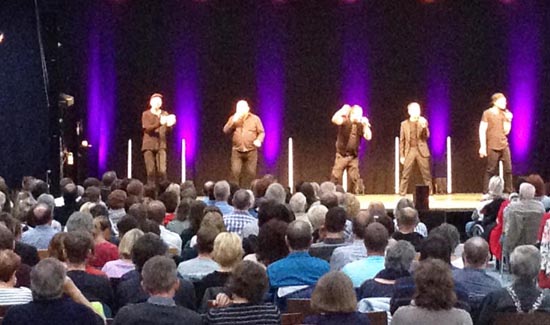 Da wird über gestörte Zweisamkeit und Karrierechancen international ebenso nachgedacht, wie über die scheinbare Tatsache, dass verschiedene Typen Mensch immer unter ihresgleichen bleiben. In Medleys bekommen altbekannte Melodien und Liedtexte verballhornt einen neuen Sinn. Und immer wird das Publikum aktiv mit einbezogen. Einfach „nur“ auf seinem Stuhl sitzend der Musik zuzuhören, ist bei dieser Band außerhalb der Realität. Keiner kann die Leute so gut zum Mitmachen animieren, wie Memphis – alias Patrick Bopp – der diesen Part während des nahezu zweistündigen Programms übernimmt. So werden in eingedeutschtem Spanisch die Abläufe auf einem Flughafen und die Bewegungen eines Flugzeugs nachgeahmt oder in schnellem Wechsel vom Stand ins Sitzen gewechselt.