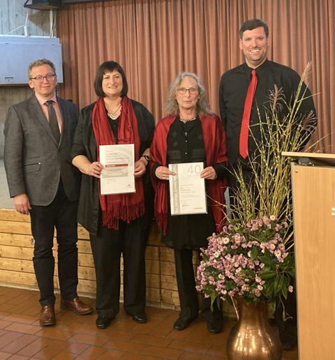 Anneliese Welz, seit mehr als 20 Jahren Vereinsvorsitzende, kam 1986 in Verein und Chor. Sie konnte die Ehrung für 40 Jahre Singetätigkeit des Schwäbischen Chorverbandes mit Urkunde und Brosche entgegennehmen. Beate Wahl war schon als Kind im damaligen Kinderchor unter Leitung von Hilde Dollmaier aktiv und kam schon bald danach in den gemischten Chor. Sie hat seit langer Zeit die wichtige Aufgabe der Vereinskassierin inne und erhielt die Ehrung des Deutschen Chorverbandes für 50 Jahre aktive Singetätigkeit.Beide Sängerinnen gehören zum Sopran und bringen sich mit ihren Ehrenämtern vielfach in die organisatorische Vereinsarbeit ein.