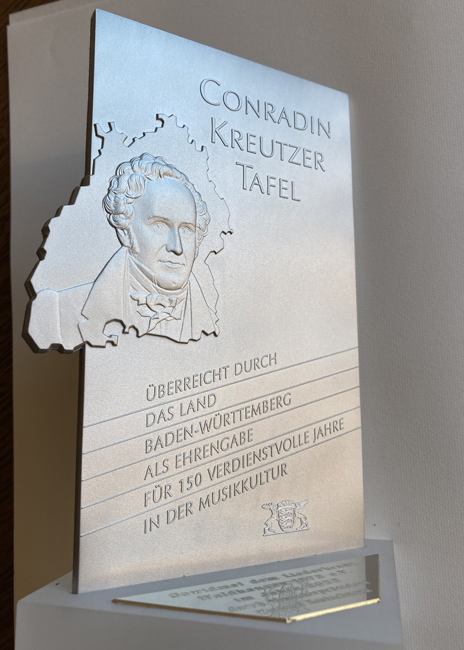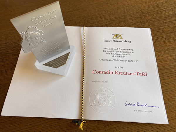 Die Verleihung der Conradin-Kreutzer-Tafel erfolgt seit 1998 auf Initiative des damaligen Ministerpräsidenten Erwin Teufel. Damit sollen Vereine ausgezeichnet werden, die auf ein mindestens 150-jähriges Bestehen zurückblicken können. In einem Antragsverfahren mussten bereits im letzten Jahr verschiedene Unterlagen zur Vereinsgeschichte eingereicht werden, die einerseits den Erhalt der Zelter-Plakette für das 100-Jährige und andererseits die Aktivitäten in den letzten 50 Jahren nachzuweisen hatten. Die sehr schön gestaltete Tafel erinnert an den 1780 in Meßkirch geborenen Komponisten und Hofkapellmeister Conradin Kreutzer, der aus sehr ärmlichen Verhältnissen stammte, eines von elf Kindern einer Müllersfamilie war, und durch besondere Förderung in Zwiefalten und anderen Klosterschulen eine umfassende musikalische Bildung erhielt. Später vertonte er neben seinen Opern und Orchesterstücken auch Gedichte von Ludwig Uhland, die lange Zeit zum Repertoire von Männerchören gehörten.